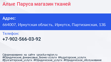 Алые Паруса, магазин тканей по адресу 664007, Иркутская область, Иркутск, Партизанская, 13Б в дальнейшем Организация, размещена в следующих категориях: