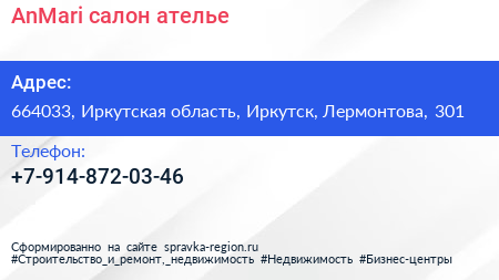 AnMari, салон-ателье по адресу 664033, Иркутская область, Иркутск, Лермонтова, 301 в дальнейшем Организация, размещена в следующих категориях: