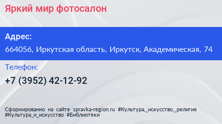Яркий мир, фотосалон по адресу 664056, Иркутская область, Иркутск, Академическая, 74 в дальнейшем Организация, размещена в следующих категориях:
