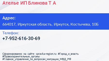 Ателье, ИП Блинова Т.А. по адресу 664017, Иркутская область, Иркутск, Костычева, 10Б в дальнейшем Организация, размещена в следующих категориях: