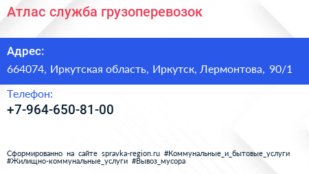 Атлас, служба грузоперевозок по адресу 664074, Иркутская область, Иркутск, Лермонтова, 90/1 в дальнейшем Организация, размещена в следующих категориях: