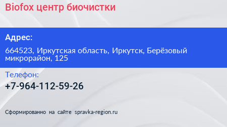 Biofox, центр биочистки по адресу 664523, Иркутская область, Иркутск, Берёзовый микрорайон, 125 в дальнейшем Организация, размещена в следующих категориях: