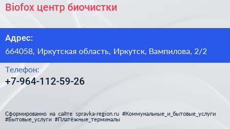 Biofox, центр биочистки по адресу 664058, Иркутская область, Иркутск, Вампилова, 2/2 в дальнейшем Организация, размещена в следующих категориях: