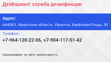 ДезВариант, служба дезинфекции по адресу 664043, Иркутская область, Иркутск, Берёзовая Роща, 30 в дальнейшем Организация, размещена в следующих категориях: