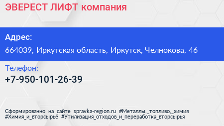 ЭВЕРЕСТ-ЛИФТ, компания по адресу 664039, Иркутская область, Иркутск, Челнокова, 46 в дальнейшем Организация, размещена в следующих категориях: