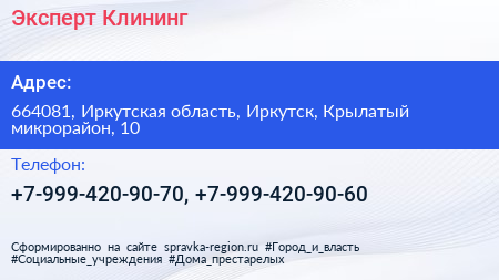 Эксперт Клининг по адресу 664081, Иркутская область, Иркутск, Крылатый микрорайон, 10 в дальнейшем Организация, размещена в следующих категориях: