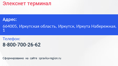 Элекснет, терминал по адресу 664005, Иркутская область, Иркутск, Иркута Набережная, 1 в дальнейшем Организация, размещена в следующих категориях: