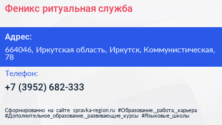 Феникс, ритуальная служба по адресу 664046, Иркутская область, Иркутск, Коммунистическая, 78 в дальнейшем Организация, размещена в следующих категориях: