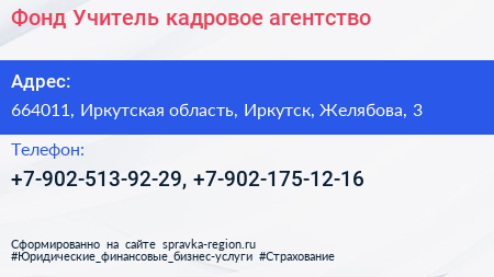 Фонд Учитель, кадровое агентство по адресу 664011, Иркутская область, Иркутск, Желябова, 3 в дальнейшем Организация, размещена в следующих категориях: