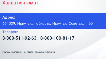 Халва, почтомат по адресу 664009, Иркутская область, Иркутск, Советская, 65 в дальнейшем Организация, размещена в следующих категориях: