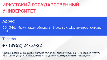 ИРКУТСКИЙ ГОСУДАРСТВЕННЫЙ УНИВЕРСИТЕТ по адресу 664046, Иркутская область, Иркутск, Дальневосточная, 55а в дальнейшем Организация, размещена в следующих категориях: