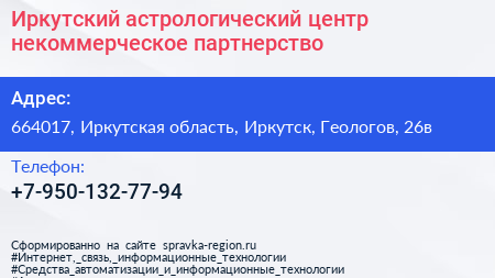 Иркутский астрологический центр, некоммерческое партнерство по адресу 664017, Иркутская область, Иркутск, Геологов, 26в в дальнейшем Организация, размещена в следующих категориях: