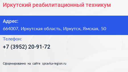 Иркутский реабилитационный техникум по адресу 664007, Иркутская область, Иркутск, Ямская, 50 в дальнейшем Организация, размещена в следующих категориях: