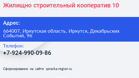 Жилищно-строительный кооператив №10 по адресу 664007, Иркутская область, Иркутск, Декабрьских Событий, 96 в дальнейшем Организация, размещена в следующих категориях: