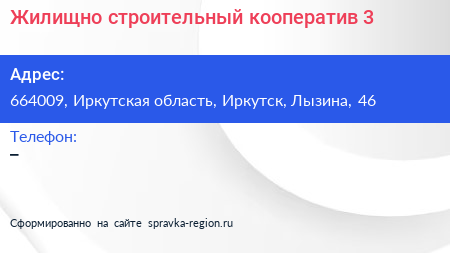Жилищно-строительный кооператив №3 по адресу 664009, Иркутская область, Иркутск, Лызина, 46 в дальнейшем Организация, размещена в следующих категориях: