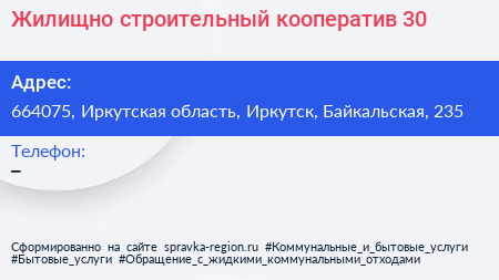 Жилищно-строительный кооператив №30 по адресу 664075, Иркутская область, Иркутск, Байкальская, 235 в дальнейшем Организация, размещена в следующих категориях: