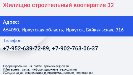 Жилищно-строительный кооператив №32 по адресу 664050, Иркутская область, Иркутск, Байкальская, 316 в дальнейшем Организация, размещена в следующих категориях: