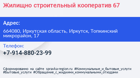 Жилищно-строительный кооператив №67 по адресу 664080, Иркутская область, Иркутск, Топкинский микрорайон, 17 в дальнейшем Организация, размещена в следующих категориях: