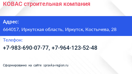 КОВАС, строительная компания по адресу 664017, Иркутская область, Иркутск, Костычева, 28 в дальнейшем Организация, размещена в следующих категориях: