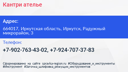 Кантри, ателье по адресу 664017, Иркутская область, Иркутск, Радужный микрорайон, 3 в дальнейшем Организация, размещена в следующих категориях: