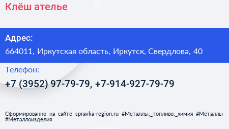 Клёш, ателье по адресу 664011, Иркутская область, Иркутск, Свердлова, 40 в дальнейшем Организация, размещена в следующих категориях: