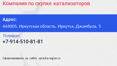 Компания по скупке катализаторов по адресу 664005, Иркутская область, Иркутск, Джамбула, 5 в дальнейшем Организация, размещена в следующих категориях: