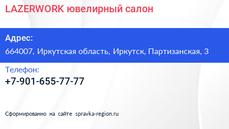 LAZERWORK, ювелирный салон по адресу 664007, Иркутская область, Иркутск, Партизанская, 3 в дальнейшем Организация, размещена в следующих категориях:
