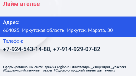 Лайм, ателье по адресу 664025, Иркутская область, Иркутск, Марата, 30 в дальнейшем Организация, размещена в следующих категориях: