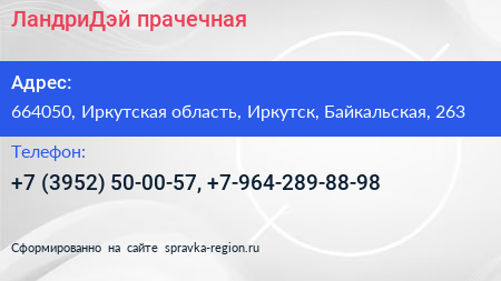 ЛандриДэй, прачечная по адресу 664050, Иркутская область, Иркутск, Байкальская, 263 в дальнейшем Организация, размещена в следующих категориях: