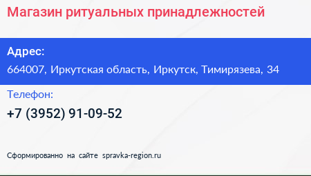 Магазин ритуальных принадлежностей по адресу 664007, Иркутская область, Иркутск, Тимирязева, 34 в дальнейшем Организация, размещена в следующих категориях: