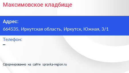 Максимовское кладбище по адресу 664535, Иркутская область, Иркутск, Южная, 3/1 в дальнейшем Организация, размещена в следующих категориях: