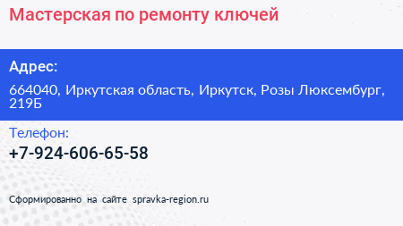 Мастерская по ремонту ключей по адресу 664040, Иркутская область, Иркутск, Розы Люксембург, 219Б в дальнейшем Организация, размещена в следующих категориях: