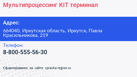 Мультипроцессинг KIT, терминал по адресу 664040, Иркутская область, Иркутск, Павла Красильникова, 219 в дальнейшем Организация, размещена в следующих категориях: