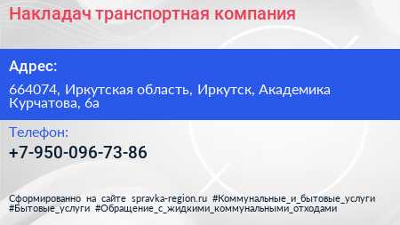 Накладач, транспортная компания по адресу 664074, Иркутская область, Иркутск, Академика Курчатова, 6а в дальнейшем Организация, размещена в следующих категориях: