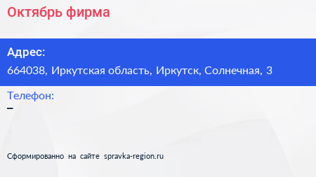 Октябрь, фирма по адресу 664038, Иркутская область, Иркутск, Солнечная, 3 в дальнейшем Организация, размещена в следующих категориях: