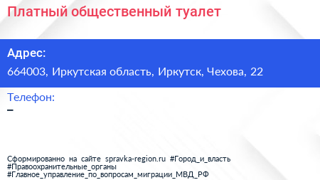 Платный общественный туалет по адресу 664003, Иркутская область, Иркутск, Чехова, 22 в дальнейшем Организация, размещена в следующих категориях: