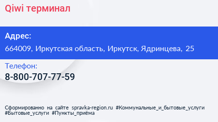 Qiwi, терминал по адресу 664009, Иркутская область, Иркутск, Ядринцева, 25 в дальнейшем Организация, размещена в следующих категориях: