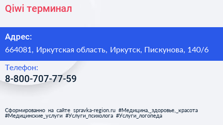 Qiwi, терминал по адресу 664081, Иркутская область, Иркутск, Пискунова, 140/6 в дальнейшем Организация, размещена в следующих категориях: