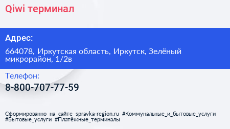 Qiwi, терминал по адресу 664078, Иркутская область, Иркутск, Зелёный микрорайон, 1/2в в дальнейшем Организация, размещена в следующих категориях: