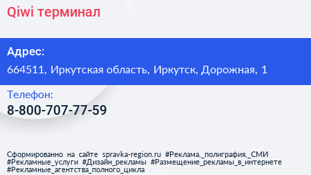 Qiwi, терминал по адресу 664511, Иркутская область, Иркутск, Дорожная, 1 в дальнейшем Организация, размещена в следующих категориях:
