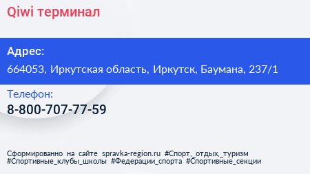 Qiwi, терминал по адресу 664053, Иркутская область, Иркутск, Баумана, 237/1 в дальнейшем Организация, размещена в следующих категориях: