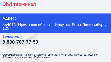 Qiwi, терминал по адресу 664013, Иркутская область, Иркутск, Розы Люксембург, 125 в дальнейшем Организация, размещена в следующих категориях:
