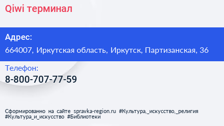 Qiwi, терминал по адресу 664007, Иркутская область, Иркутск, Партизанская, 36 в дальнейшем Организация, размещена в следующих категориях: