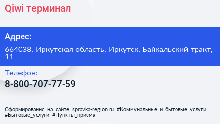 Qiwi, терминал по адресу 664038, Иркутская область, Иркутск, Байкальский тракт, 11 в дальнейшем Организация, размещена в следующих категориях: