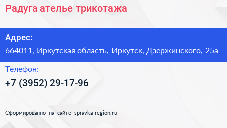 Радуга, ателье трикотажа по адресу 664011, Иркутская область, Иркутск, Дзержинского, 25а в дальнейшем Организация, размещена в следующих категориях: