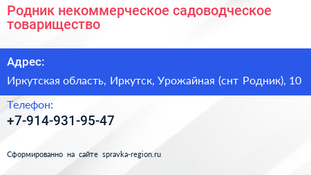 Родник, некоммерческое садоводческое товарищество по адресу Иркутская область, Иркутск, Урожайная (снт Родник), 10 в дальнейшем Организация, размещена в следующих категориях: