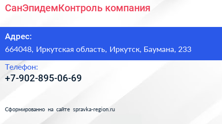СанЭпидемКонтроль, компания по адресу 664048, Иркутская область, Иркутск, Баумана, 233 в дальнейшем Организация, размещена в следующих категориях:
