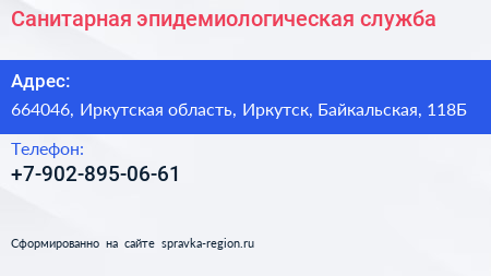 Санитарная эпидемиологическая служба по адресу 664046, Иркутская область, Иркутск, Байкальская, 118Б в дальнейшем Организация, размещена в следующих категориях: