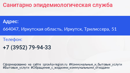 Санитарно-эпидемиологическая служба по адресу 664047, Иркутская область, Иркутск, Трилиссера, 51 в дальнейшем Организация, размещена в следующих категориях: