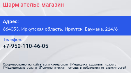 Шарм, ателье-магазин по адресу 664053, Иркутская область, Иркутск, Баумана, 214/6 в дальнейшем Организация, размещена в следующих категориях: